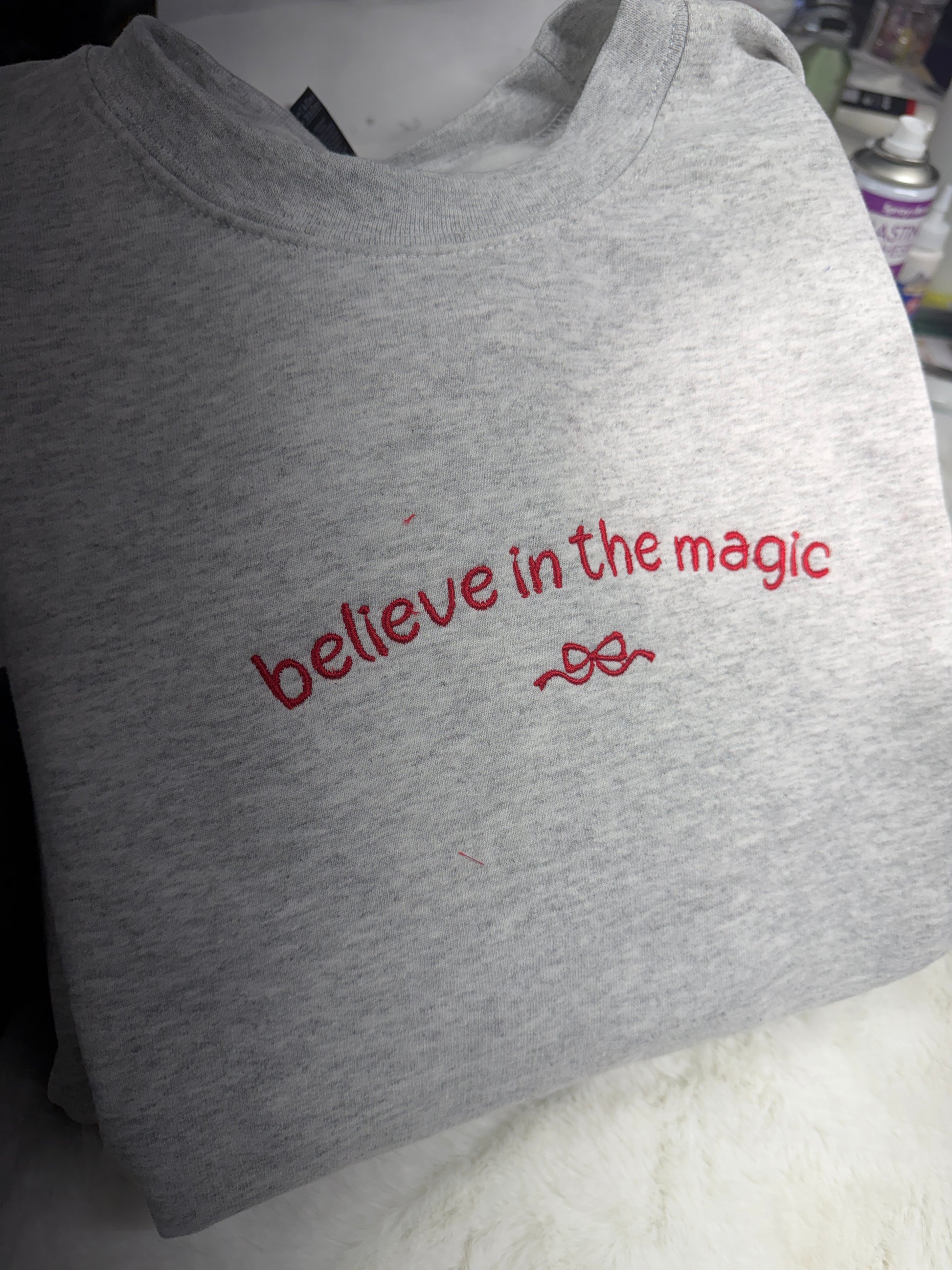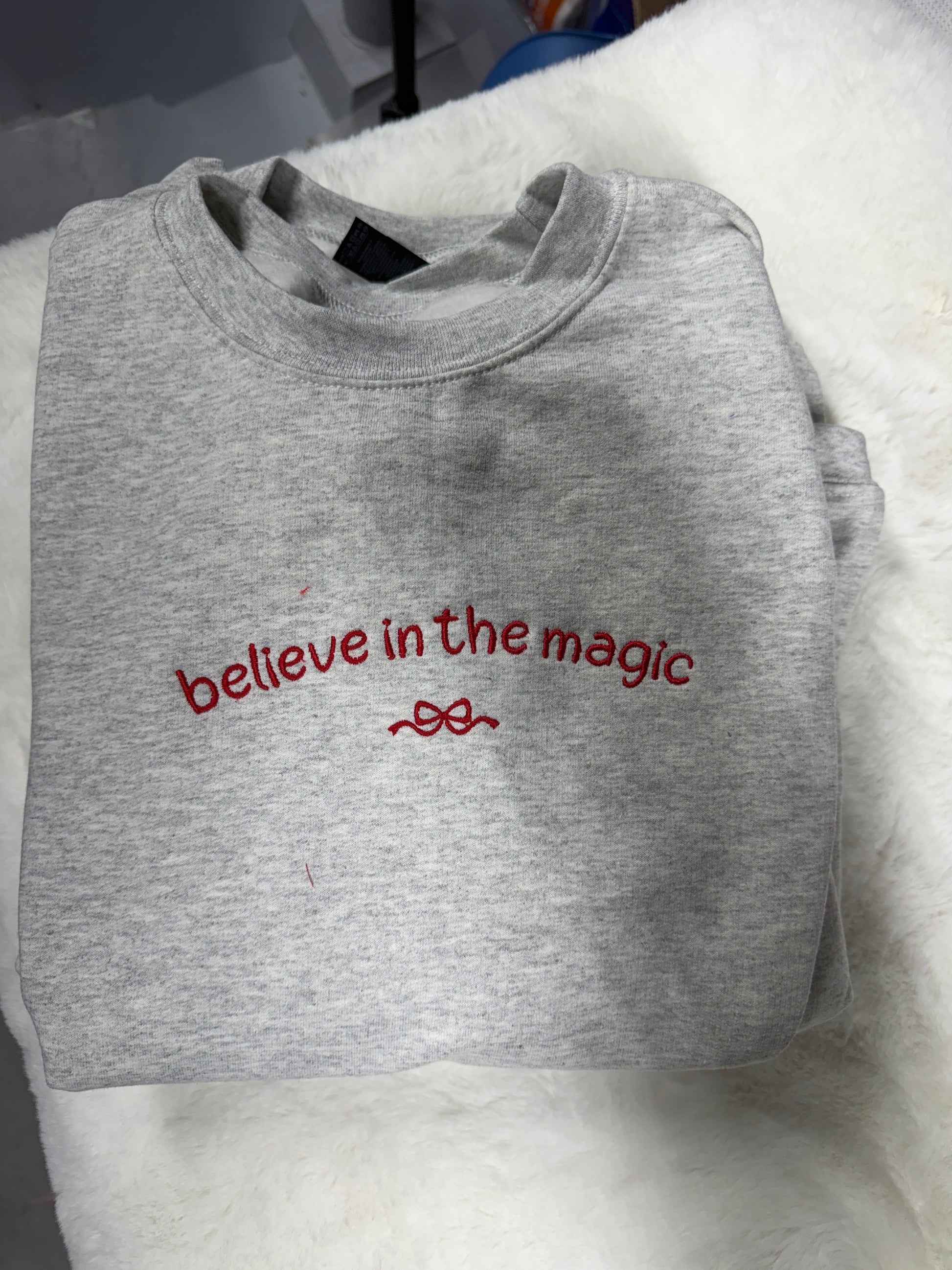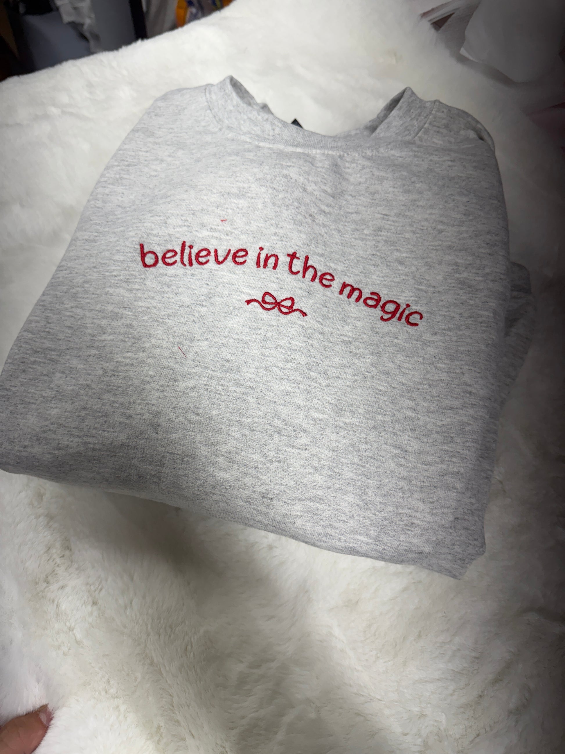 Embrace the spirit of the season with our Believe in the Magic embroidered sweater. Perfect for Christmas gatherings, its cozy design will keep you warm all winter long. The minimal yet festive design adds a touch of holiday magic to any outfit. Spread holiday cheer with this must-have addition to your wardrobe.